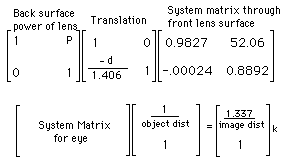 Design of Scale-Model Eye![]() The scale model eye was developed by scaling an actual cross-sectional picture of an eye from Light & Vision by Mueller & Rudolph. Then a total distance of 2.4 cm from cornea to retina was adopted from Hecht, along with his values for the indices of refraction for all components. The actual measurements for radii of curvature and separation were scaled using a solver program (TK!Solver) until a parallel incoming ray fell on the retina. It is not known whether the eye shown by Mueller&Rudolph is typical. |