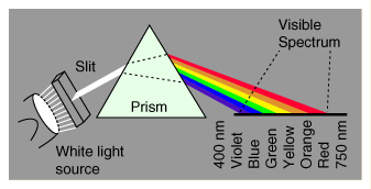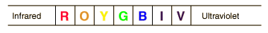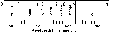 Color![]() It is common practice to define pure colors in terms of the wavelengths of light as shown. This works well for spectral colors but it is found that many different combinations of light wavelengths can produce the same perception of color. ![]() This progression from left to right is from long wavelength to short wavelength, and from low frequency to high frequency light. The wavelengths are commonly expressed in nanometers (1 nm = 10-9 m). The visible spectrum is roughly from 700 nm (red end) to 400 nm (violet end). The letter I in the sequence above is for indigo - no longer commonly used as a color name. It is included above strictly for the reason of making the sequence easier to say as a mnemonic, like a person's name: Roy G. Biv - a tradition in the discussion of color. The inherently distinguishable characteristics of color are hue, saturation, and brightness. Color measurement systems characterize colors in various parameters which relate to hue, saturation, and brightness. They include the subjective Munsell and Ostwald systems and the quantitative CIE color system. ![]() White light, or nearly white light from the Sun, contains a continuous distribution of wavelengths. The light from the Sun is essentially that of a blackbody radiator at 5780 K. The wavelengths (spectral colors) of white light can be separated by a dispersive medium like a prism. Even more effective separation can be achieved with a diffraction grating. |