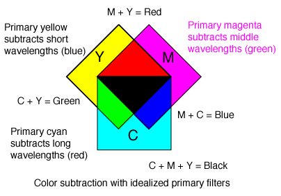 Subtractive color mixing is the kind of mixing you get if you illuminate colored filters with white light from behind, as illustrated at left. The commonly used subtractive primary colors are cyan, magenta and yellow, and if you overlap all three in effectively equal mixture, all the light is subtracted giving black. Subtractive color mixing is more complex than the additive color mixing you get with colored spotlights.