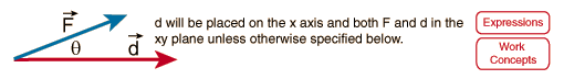 Work as a Scalar ProductYou may enter values in any of the boxes below. Then click on the symbol for either the scalar product or the angle. The vectors F and d cannot be unambiguously calculated from the scalar product and the angle. If the angle is changed, then d will be placed along the x-axis and F in the xy plane.