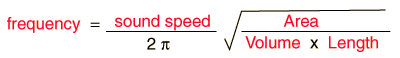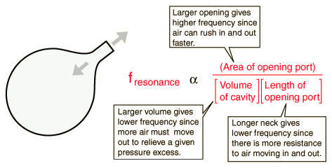 Cavity ResonanceAn air cavity will exhibit a single resonant frequency. If extra air is pushed into the volume and then released, the pressure will drive it out. But, acting somewhat like a mass on a spring which is pulled down and then released, it will overshoot and produce a slight vacuum in the cavity. The air will oscillate into and out of the container for a few cycles at a natural frequency. The qualitative nature of the frequency determining factors: ![]() Actually the frequency depends upon the square root of these factors and also upon the speed of sound, as you can see in the actual calculation of the frequency. But the above illustration shows the physical factors that are involved in determining the resonant frequency.