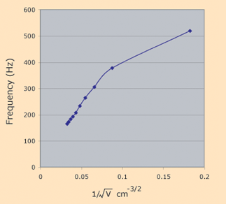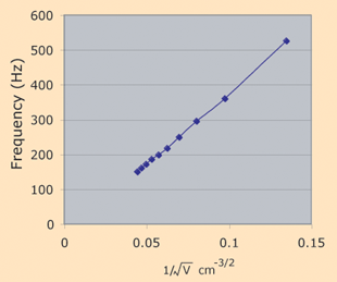 The data for the large glass bottle is not a bad approximation for a straight line for the larger volumes, but departs drastically from the straight line for small volumes. That's not so surprising since those resonances were close to the top of the bottle and very hard to sound. It certainly didn't appear like an enclosed cavity at those last two measurements.