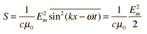 Energy in Electromagnetic WavesElectromagnetic waves carry energy as they travel through empty space. There is an energy density associated with both the electric and magnetic fields. The rate of energy transport per unit area is described by the vector ![]() which is called the Poynting vector. This expression is a vector product, and since the magnetic field is perpendicular to the electric field, the magnitude can be written ![]() The rate of energy transport S is perpendicular to both E and B and in the direction of propagation of the wave. A condition of the wave solution for a plane wave is Bm = Em/c so that the average intensity for a plane wave can be written ![]() This makes use of the fact that the average of the square of a sinusoidal function over a whole number of periods is just 1/2. |
