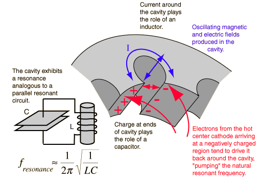 The MagnetronThe microwave radiation of microwave ovens and some radar applications is produced by a device called a magnetron. ![]() The magnetron is called a "crossed-field" device in the industry because both magnetic and electric fields are employed in its operation, and they are produced in perpendicular directions so that they cross. The applied magnetic field is constant and applied along the axis of the circular device illustrated. The power to the device is applied to the center cathode which is heated to supply energetic electrons which would, in the absence of the magnetic field, tend to move radially outward to the ring anode which surrounds it. ![]() Electrons are released at the center hot cathode by the process of thermionic emission and have an accelerating field which moves them outward toward the anode. The axial magnetic field exerts a magnetic force on these charges which is perpendicular to their initially radial motion, and they tend to be swept around the circle. In this way, work is done on the charges and therefore energy from the power supply is given to them. As these electrons sweep toward a point where there is excess negative charge, that charge tends to be pushed back around the cavity, imparting energy to the oscillation at the natural frequency of the cavity. This driven oscillation of the charges around the cavities leads to radiation of electromagnetic waves, the output of the magnetron.