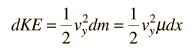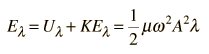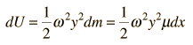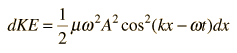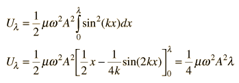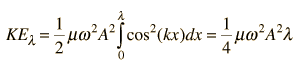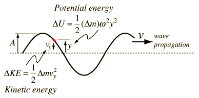 Energy in a String WaveThe energy associated with a traveling wave in a stretched string is conveniently expressed as the energy per wavelength. ![]() The energy of a small segment of the string can be expressed as the sum of the kinetic energy and elastic potential energy of the segment. The differential form of the elastic potential energy is ![]() Using the description of a traveling wave ![]() the potential energy expression becomes ![]() The energy for a full wavelength can be found by integrating this expression at a given time, and it is most convenient to set t=0 for this integration. The energy for one wavelength along the string is ![]() The differential kinetic energy is ![]() Using the velocity expression ![]() the kinetic energy takes the form ![]() and again setting t=0 for simplification ![]() The total energy associated with a wavelength is ![]() Since this amount of energy is transported a distance of one wavelength along the string in one period, this expression can be used to calculate the power transmitted along a string.